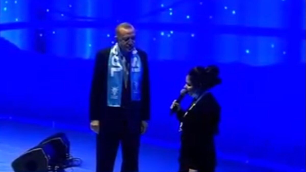 AK Parti'nin seçim şarkılarından olan 'Beraber Yürüdük' şarkısına kürsüde bir süre eşlik eden Erdoğan, daha sonra genç kızın yanına ilerledi.
