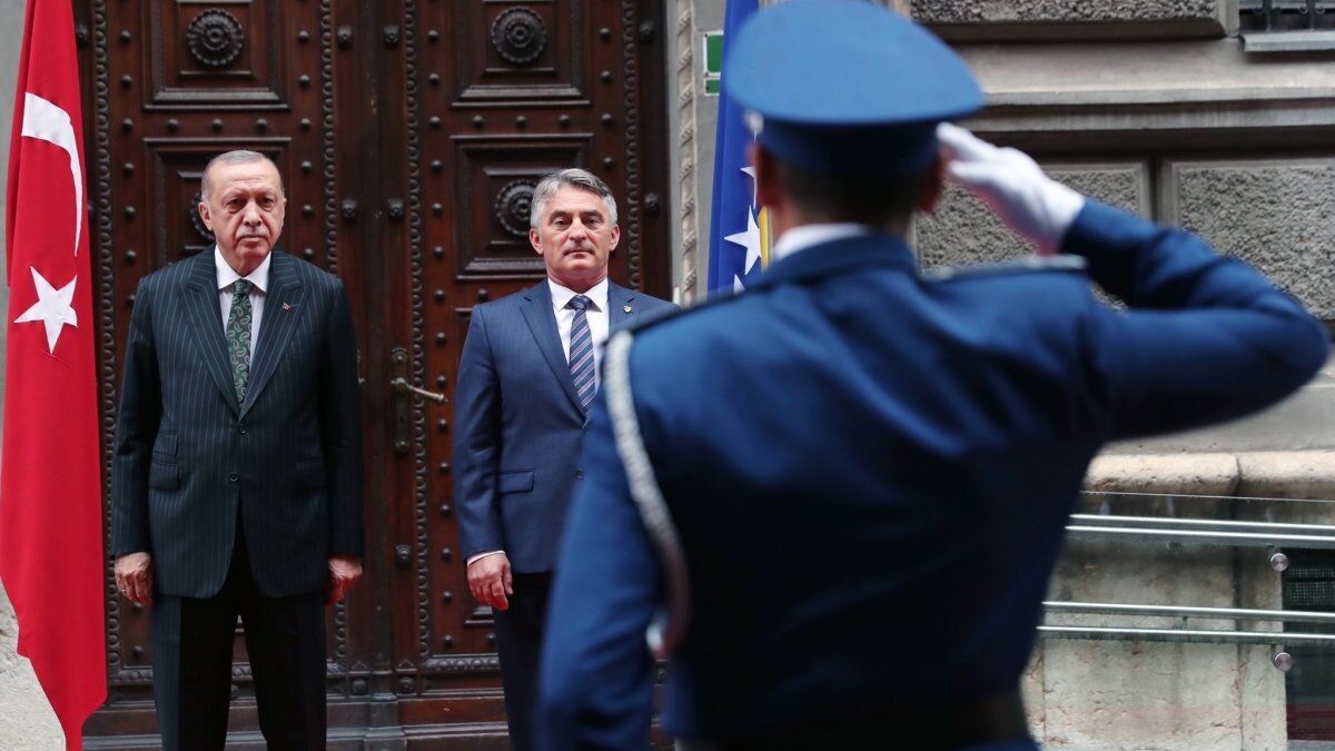 Ziyaretlerinin ardından görüşmeler için Saraybosna'daki Bosna Hersek Devlet Başkanlığı'na giden Cumhurbaşkanı Erdoğan, Devlet Başkanlığı Konseyi üyeleri tarafından resmi törenle karşılandı.