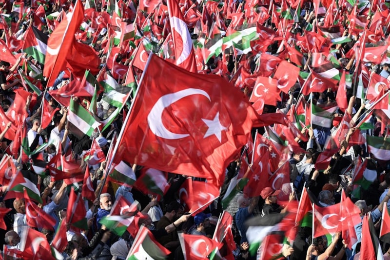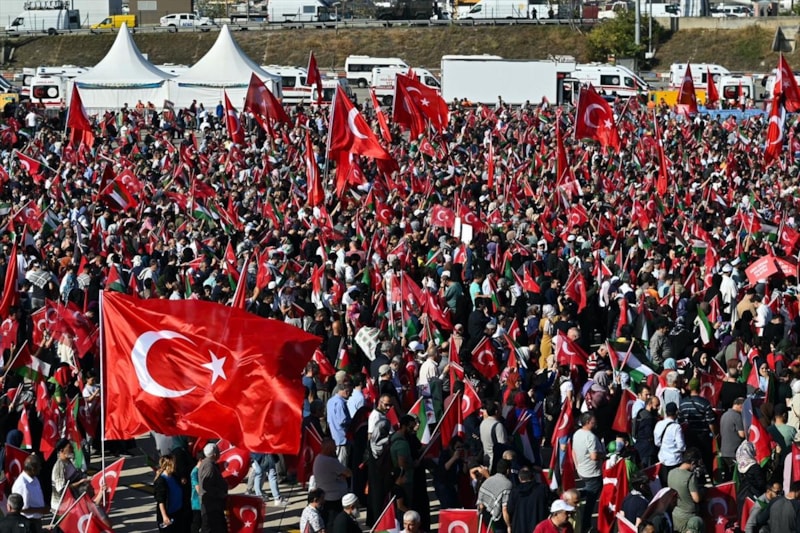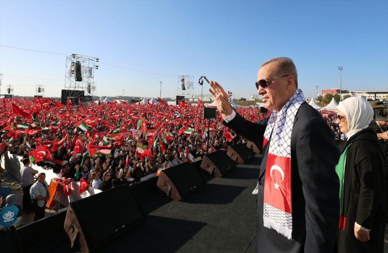 Savaşın ilk gününden itibaren arabuluculuk görevinin üstlenen Cumhurbaşkanı Erdoğan, miting alanında, "Gazze için de kıyamdayız" ifadelerini kullanarak İsrail'in savaş suçlusu olduğunun tüm dünyaya duyurulacağını bildirdi.