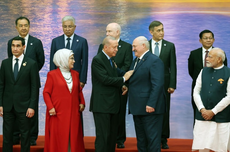 Cumhurbaşkanı Erdoğan, fotoğraf çekimi esnasında Belarus Cumhurbaşkanı Aleksandr Lukaşenko ve Hindistan Başbakanı Narendra Modi ile tokalaştı ve sohbet etti.