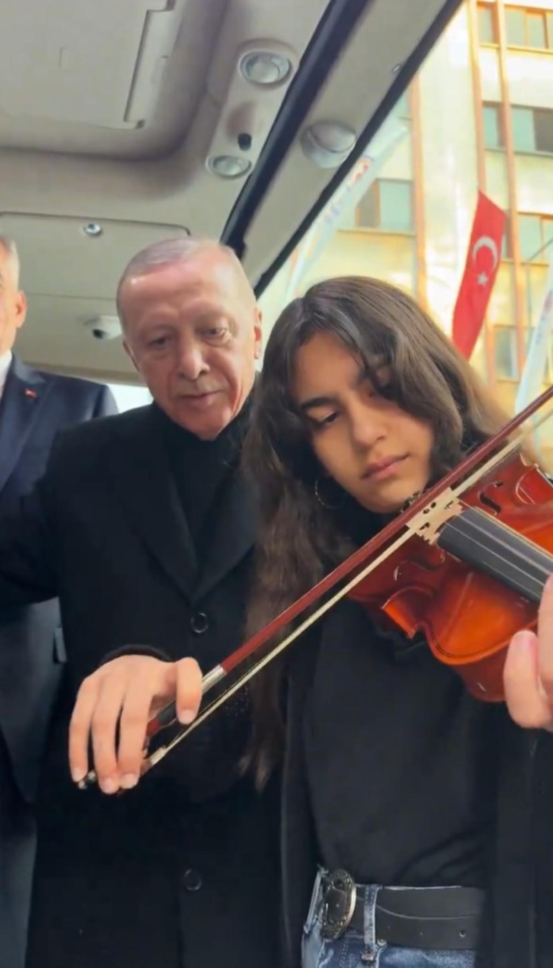 Seçim otobüsünde keman çalan konservatuar öğrencisiyle sohbet eden Cumhurbaşkanı Erdoğan, öğrencinin kemanı ile birlikte Çanakkale türküsünü seslendirdikten sonra öğrenciden eğitim ve aile durumuna ilişkin bilgi aldı.