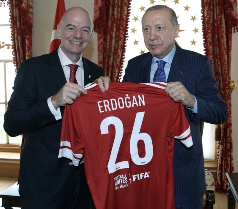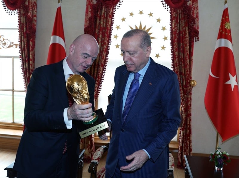 Cumhurbaşkanı Erdoğan, FIFA Başkanı Gianni Infantino'yu Dolmabahçe Sarayı'nda kabul etti. Samimi ortamda gerçekleşen ziyarette İsviçreli futbol adamı, Erdoğan'a Dünya Kupası'nı takdim etti.