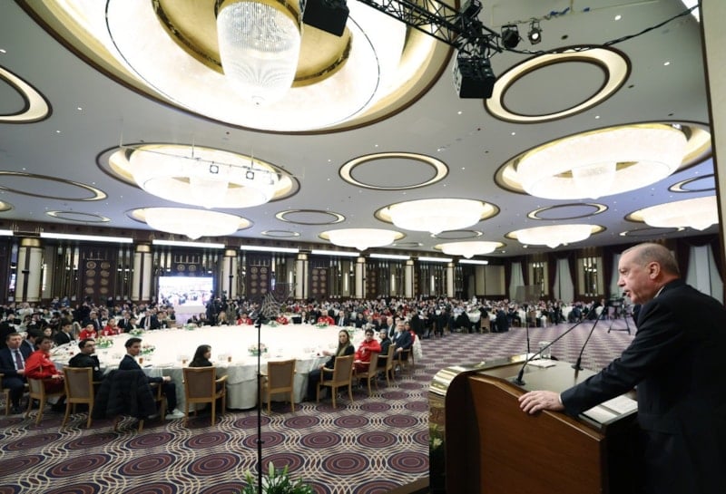 Erdoğan, gençlik merkezlerinin sayısını ülke geneline yaygınlaştırdıklarını belirterek, "Göreve geldiğimizde gençlik merkezlerimizin sayısı 9'du. Bugün bu sayı 570'e ulaştı. Yükseköğretimde 132 yeni üniversite açarak toplam üniversite sayımızı 208'e çıkardık. Yükseköğrenim yurtlarımızın sayısını 190'dan aldık 875'e yükselttik. 1 milyon yatak kapasitesine sahip konforlu, güvenli ve modern yurtlarımızı öğrencilerimizin hizmetine sunduk. Genç arkadaşlarımızın siyasette ve ülkenin kaderine yön veren karar alma mekanizmalarında hak ettikleri şekilde temsil edilmesi için seçilme yaşını önce 30'dan 25', ardından 18'e düşürdük. Ülkemizin spor altyapısına çok ciddi yatırımlar yaptık. 81 ilimizin tamamına modern stadyumlar, kapalı spor salonları, yüzme havuzları, atletizm pistleri inşa ettik. Toplam spor tesisi sayımız bin 575'ten bugün 4 bin 562'ye yükseldi. Katıldığımız olimpiyatlarda elde ettiğimiz derecelerle tarihimizin en fazla madalya sayısına ulaştık. Kadın sporcuların katılımını özellikle teşvik ettik ve milli takımlardaki kadın sporcu oranını yüzde 45'in üzerine çıkardık. Yani eğitim, siyaset, spor, sanayi, teknoloji dahil her alanda siz gençlerin yanında olmaya sizin önünüzü açmaya çalıştık ve çalışıyoruz. Bu vesileyle farklı branşlarda ülkemize getirdikleri madalyalarla kıvanç kaynağımız olan tüm sporcularımızı canı gönülden tebrik ediyor, her birinize teşekkür ediyorum" diye konuştu.