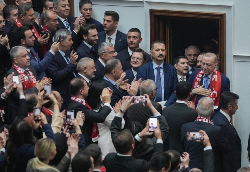 Türk bayrakları ile donatılan salonda, milli takım atkıları ile Cumhurbaşkanı Erdoğan'ı dinleyen milletvekili, kabine üyeleri ve konuklar, milli takımın galibiyet sevincini adeta bir kez daha yaşadı.