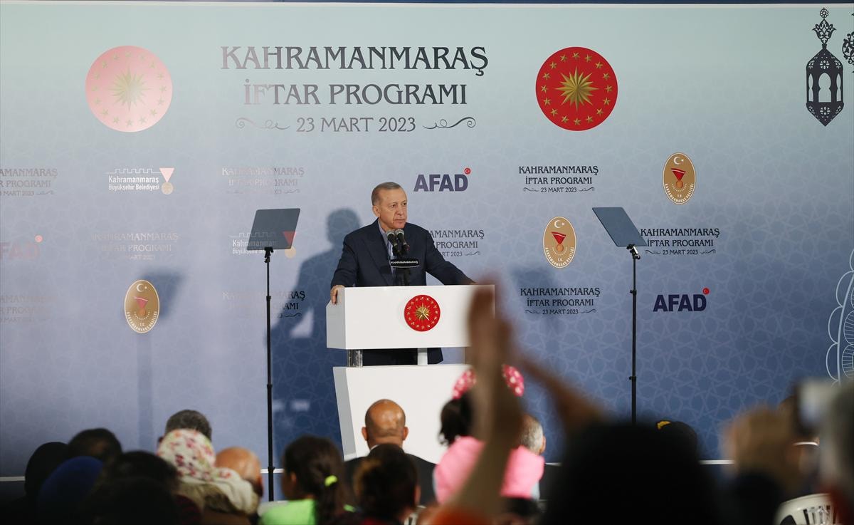Kahramanmaraş'ta afet konutları için yapılan temel atma törenine katılan Cumhurbaşkanı Erdoğan, depremzedelerle birlikte iftarını açtı.