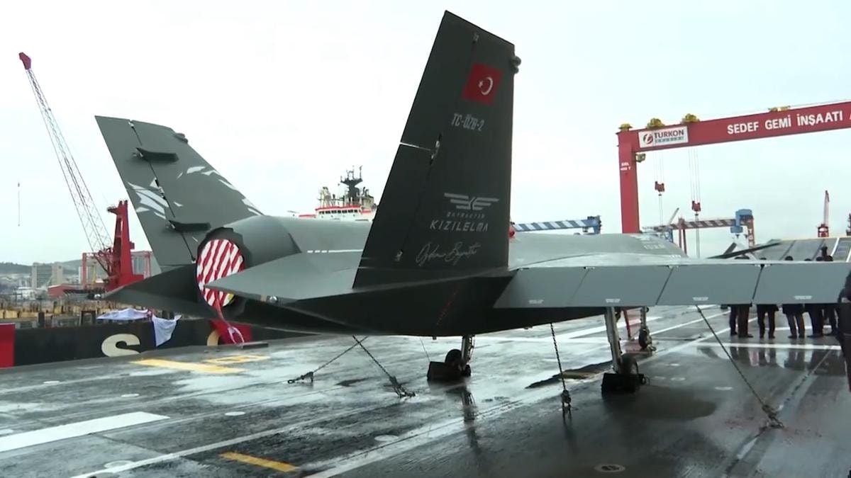 TCG Anadolu'nun Deniz Kuvvetlerine teslim töreninde, geminin uçuş güvertesinde Bayraktar Kızılelma ve kanatları katlanabilen Bayraktar TB3 SİHA da yer aldı.