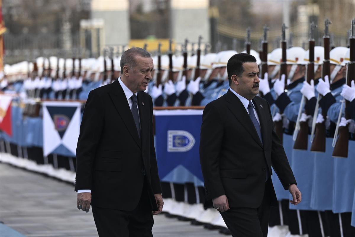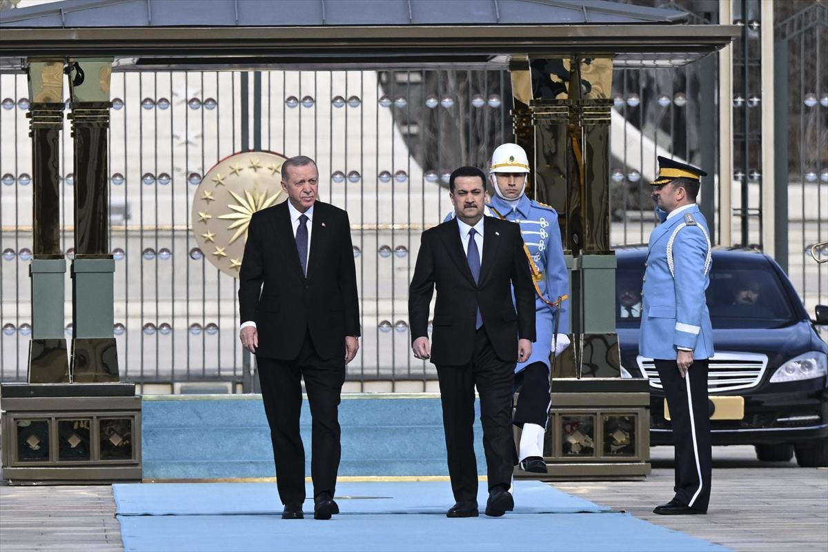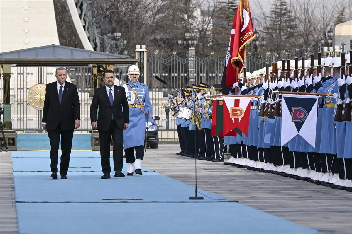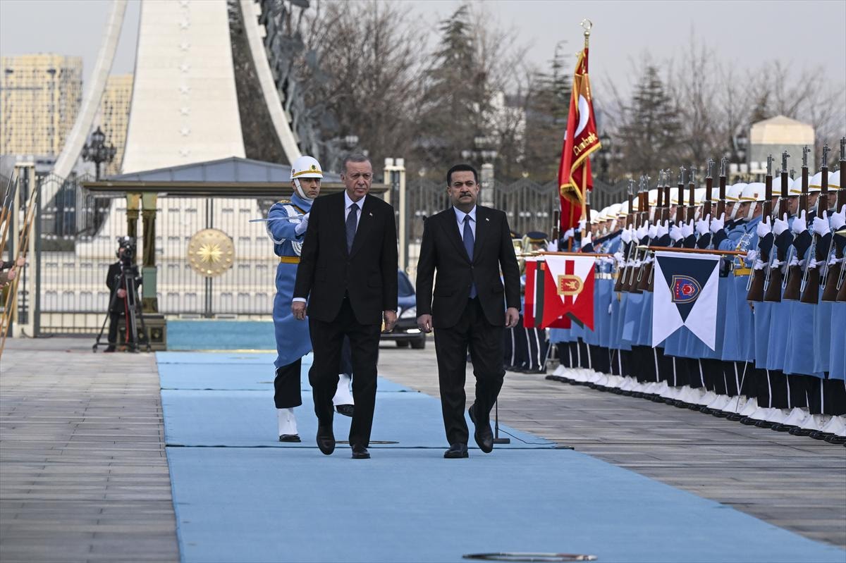 Erdoğan ve es-Sudani'nin tören alanındaki yerlerini almasının ardından 21 pare top atışı eşliğinde iki ülke milli marşları çalındı.