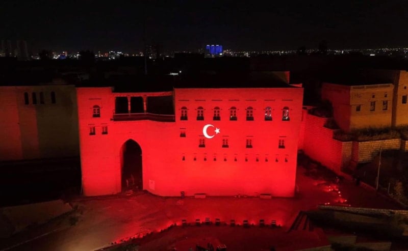 Erbil'de de cadde ve sokaklara Türk bayrakları asılırken Erbil Kalesi'ne Türk bayrağının görüntüsü yansıtıldı.