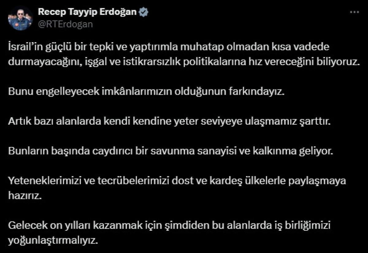 Cumhurbaşkanı Erdoğan, bir başka paylaşımında ise şu ifadeleri kullandı: