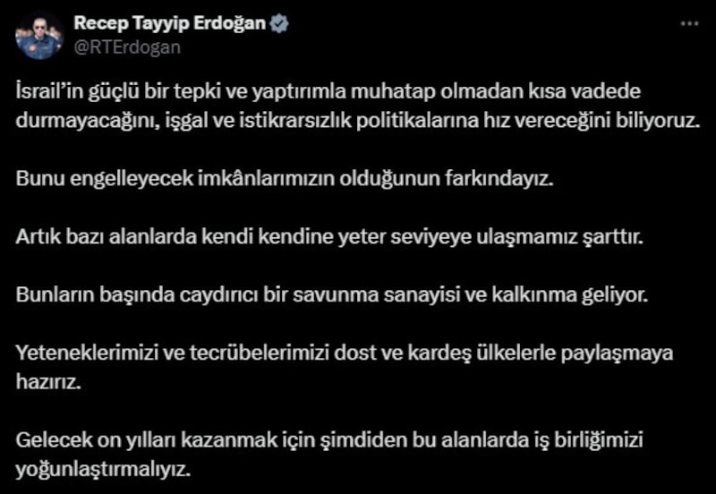 Cumhurbaşkanı Recep Tayyip Erdoğan, "İsrail'in güçlü bir tepki ve yaptırımla muhatap olmadan kısa vadede durmayacağını, işgal ve istikrarsızlık politikalarına hız vereceğini biliyoruz. Bunu engelleyecek imkanlarımızın olduğunun farkındayız" paylaşımında bulundu.