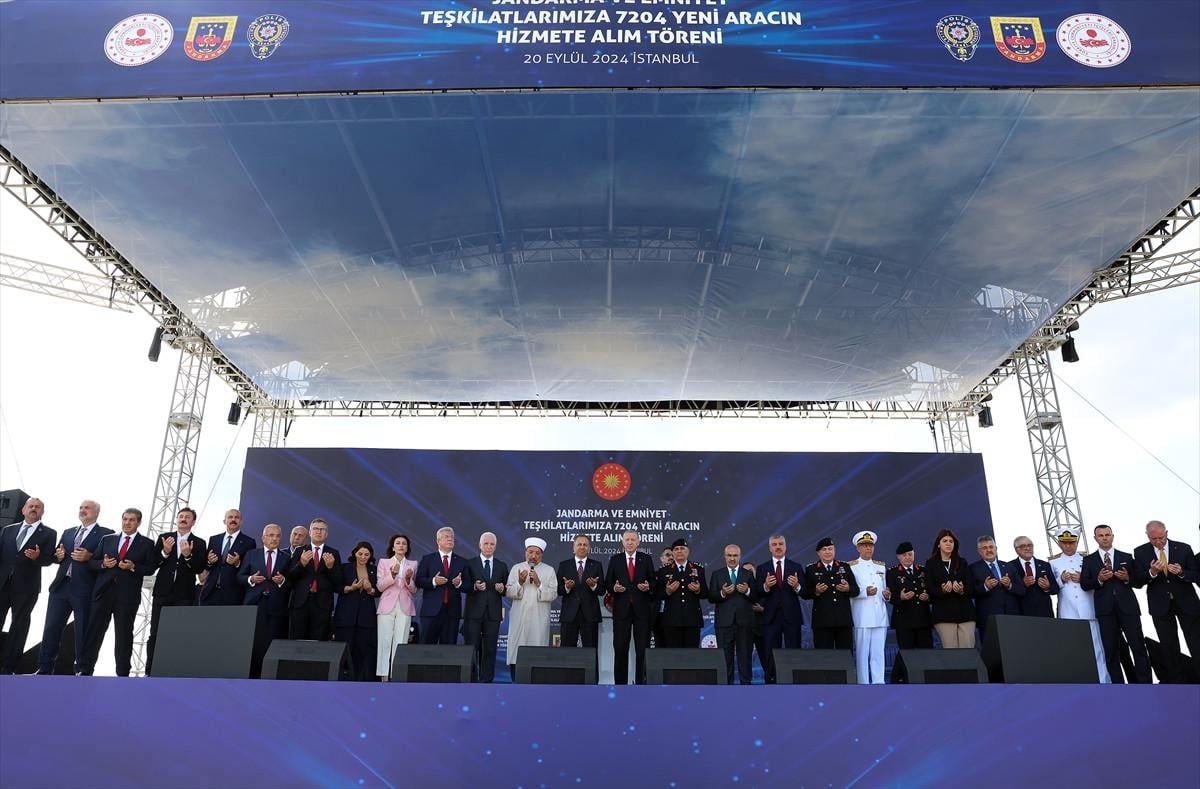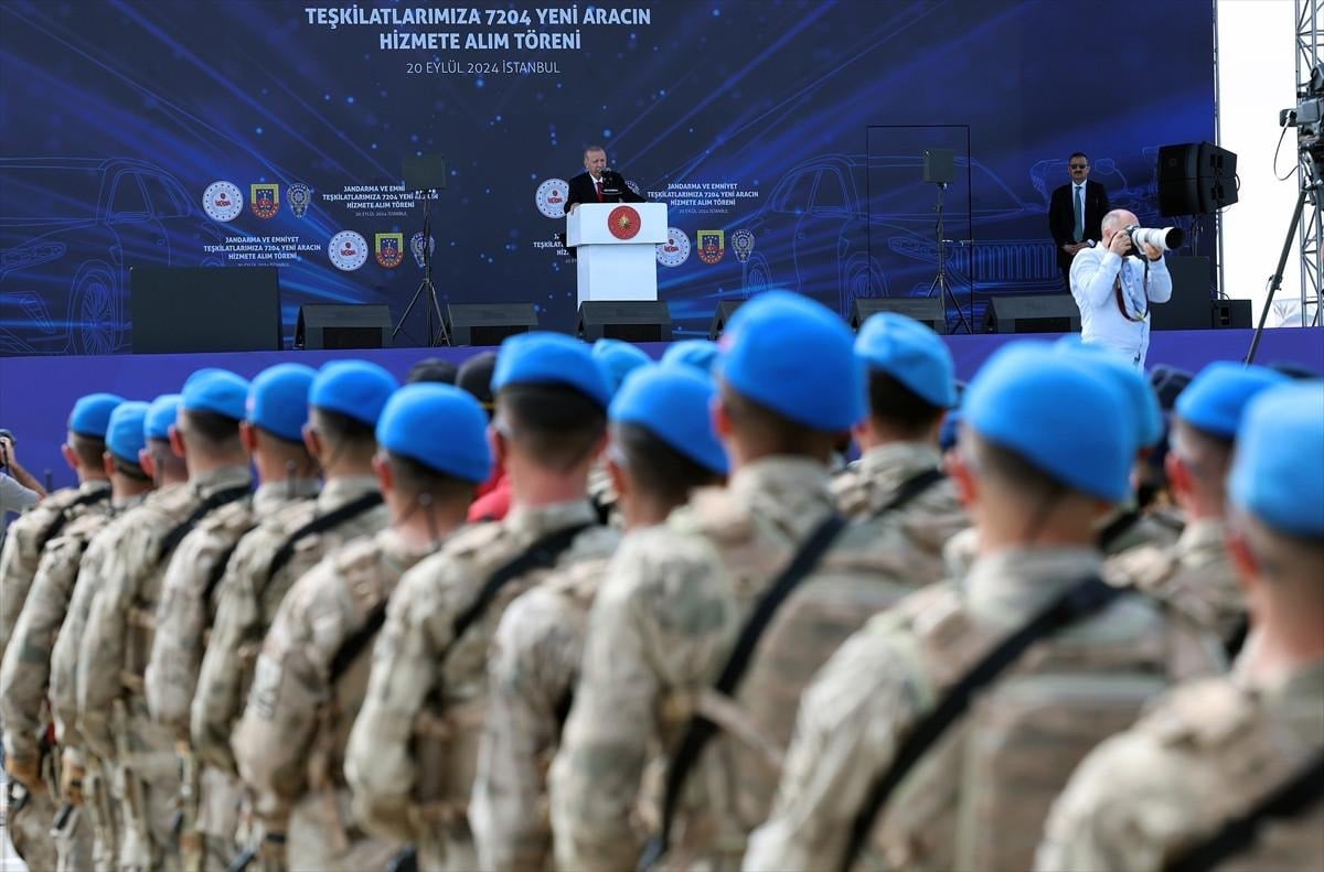 Her birinize, sizlerin şahsında tüm polis, jandarma, asker ve Sahil Güvenlik personelimize Türkiye için, Türk milleti için yaptığınız hizmetler dolayısıyla kalpten teşekkür ediyorum. Devletimize ve milletimize karşı mesuliyetlerinizi yerine getirebilmemiz için hiçbir fedakarlıktan kaçınmıyoruz. İşte bugün Jandarma ve Emniyet Teşkilatlarımıza 7 bin 204 yeni aracın hizmete alım törenini gerçekleştiriyoruz. Böylesi anlamlı bir tören vesilesiyle sizlerle beraber olmaktan duyduğum bahtiyarlığı hasseten vurgulamak isterim.