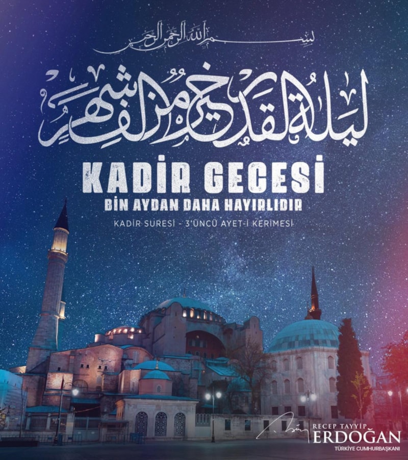 "Milletimizin ve İslam aleminin, Kur'an-ı Kerim'de bin aydan daha hayırlı olduğu müjdelenen Leyle-i Kadir'ini tebrik ediyorum. Rabbimden bizleri daha nice ramazanlara, nice Kadir Gecelerine, nice bayramlara hayırla, sağlıkla, huzurla, esenlikle eriştirmesini diliyorum."