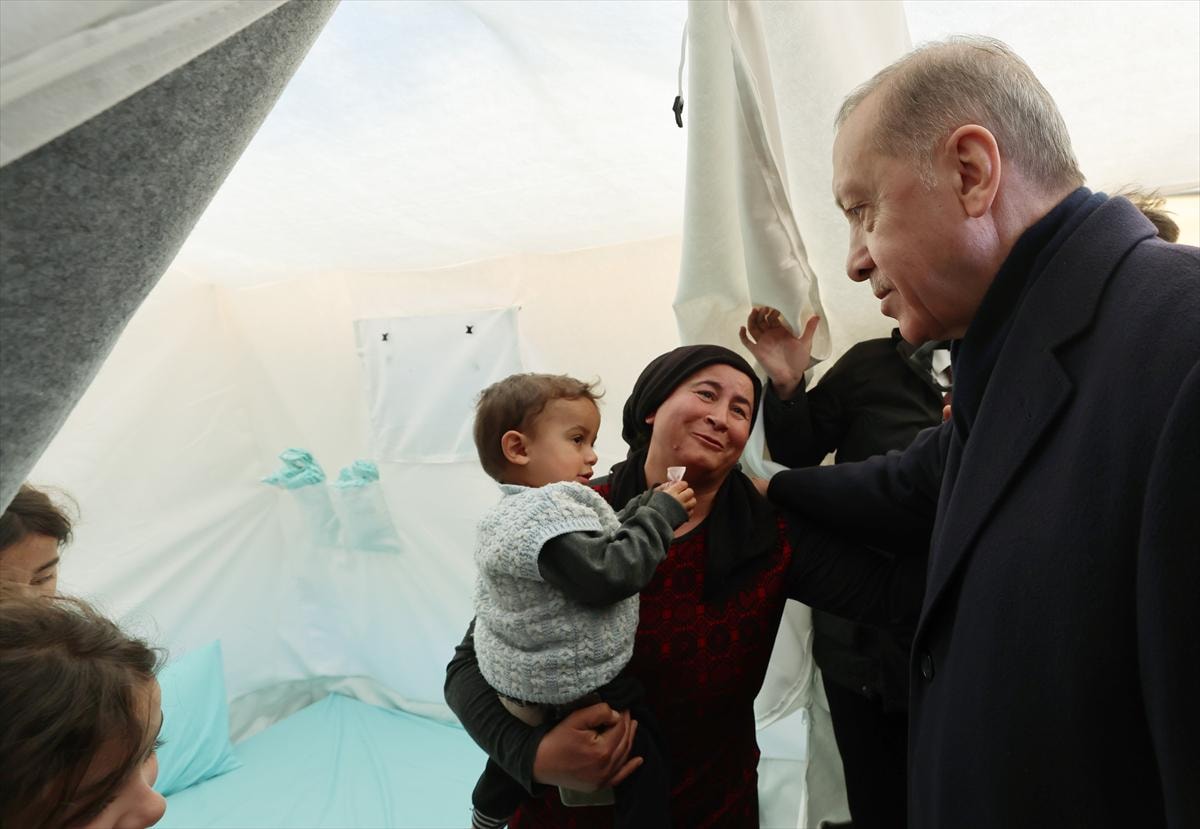 Cumhurbaşkanı, burada depremlerin ardından AFAD tarafından Onikişubat Stadyumu'nda kurulan çadır kentte incelemelerde bulundu.