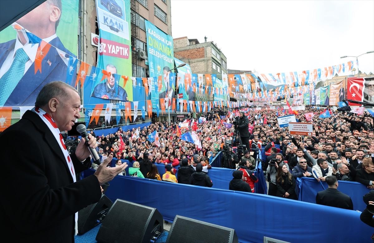 Bu vesileyle Karabük'e teşekkür borcumu da ifade etmek istiyorum. Geçtiğimiz mayıs ayında yapılan seçimlerde Cumhur İttifakı'na milletvekilliği seçimlerinde yüzde 62'yi aşan, cumhurbaşkanlığında kardeşine yüzde 64'e varan oranlarda destek verdiniz. Bunun için her birinize ayrı ayrı şükranlarımı sunuyorum. 31 Mart'ta sandıkta çok daha yüksek oy oranlarıyla yanımızda olacağınıza inanıyorum. Buna var mıyız? Sizlerin sevgisine, vefasına, kardeşliğine layık olabilmek için bizler de daha çok çalışacağız. Ben Cumhurbaşkanı olarak ekibimle çok çalışacağım ve yerel yönetimlerle el ele vereceğiz, Allah'ın izniyle Karabük'ü çok daha farklı bir yere taşıyacağız. İşçisiyle, esnafıyla, üreticisiyle, emeklisiyle, öğrencisiyle bu şehirde yaşayan her bir kardeşimin üzerimizde hakkı var. Bunları ödemekle mükellefiz. Bilhassa çalışanlarımızın ve emeklilerimizin yaşadığı sıkıntıların çözümü boynumuzun borcudur.