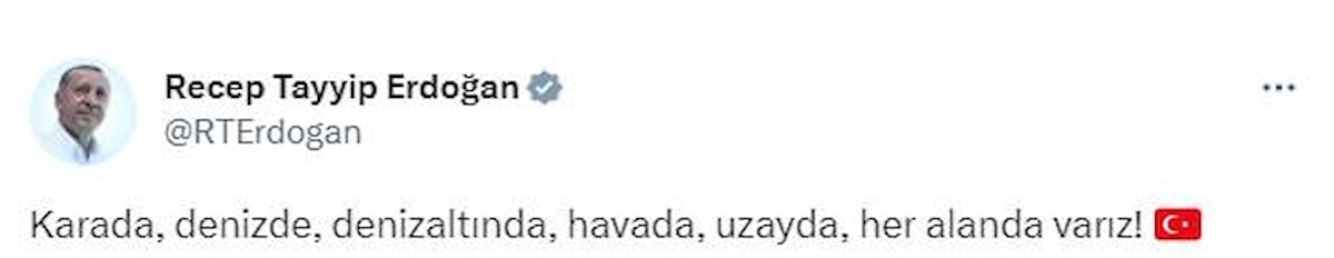 Paylaşıma ise Türk bayrağı ile birlikte, "Karada, denizde, denizaltında, havada, uzayda, her alanda varız." notunu ekledi.