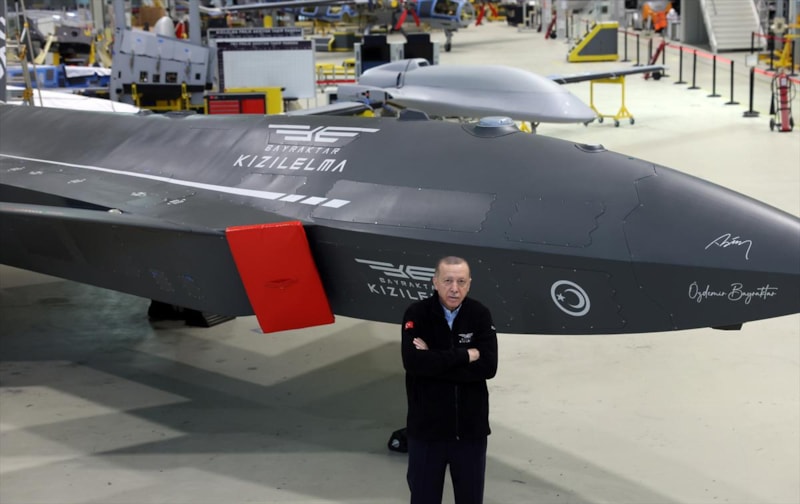 Cumhurbaşkanı Erdoğan, Bayraktar KIZILELMA İnsansız Savaş Uçağı önünde çektirdiği hatıra fotoğrafını paylaştı.