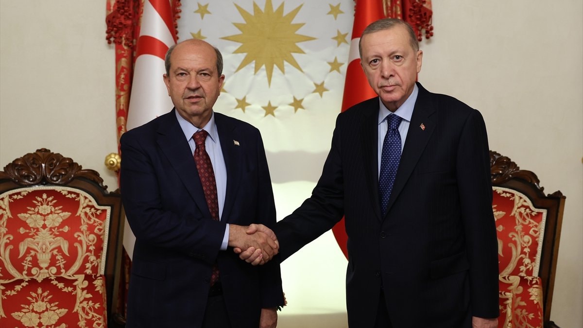 Cumhurbaşkanı Erdoğan, KKTC Cumhurbaşkanı Ersin Tatar'ı İstanbul'daki Dolmabahçe Çalışma Ofisi'nde kabbul etti.