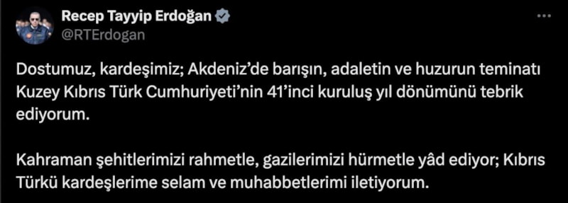 "Dostumuz, kardeşimiz, Akdeniz'de barışın, adaletin ve huzurun teminatı Kuzey Kıbrıs Türk Cumhuriyeti'nin 41'inci kuruluş yıl dönümünü tebrik ediyorum. Kahraman şehitlerimizi rahmetle, gazilerimizi hürmetle yad ediyor, Kıbrıs Türk'ü kardeşlerime selam ve muhabbetlerimi iletiyorum."