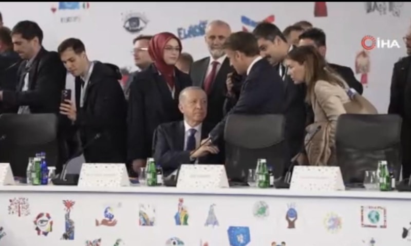 Zirvenin yapılacağı salonda konuşma öncesi Cumhurbaşkanı Erdoğan'ın yanına gelen isimlerden birisi de Fransa Cumhurbaşkanı Emmanuel Macron oldu.