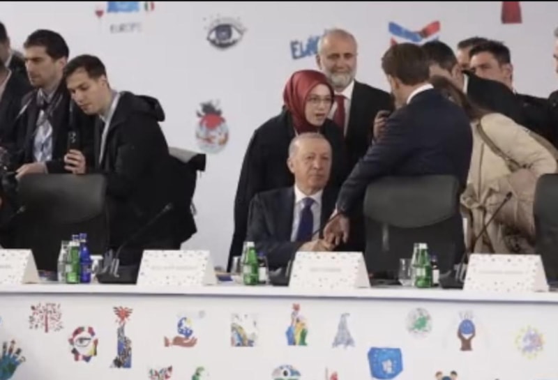 Selamlaşmak için Cumhurbaşkanı Erdoğan'ın yanına gelen Macron, elini üste koyarak üstünlük kurmak istedi. Ancak Cumhurbaşkanı Erdoğan, Macron'un sadece parmağını sıktı ve konuşma boyunca yerinden de kalkmadı.
