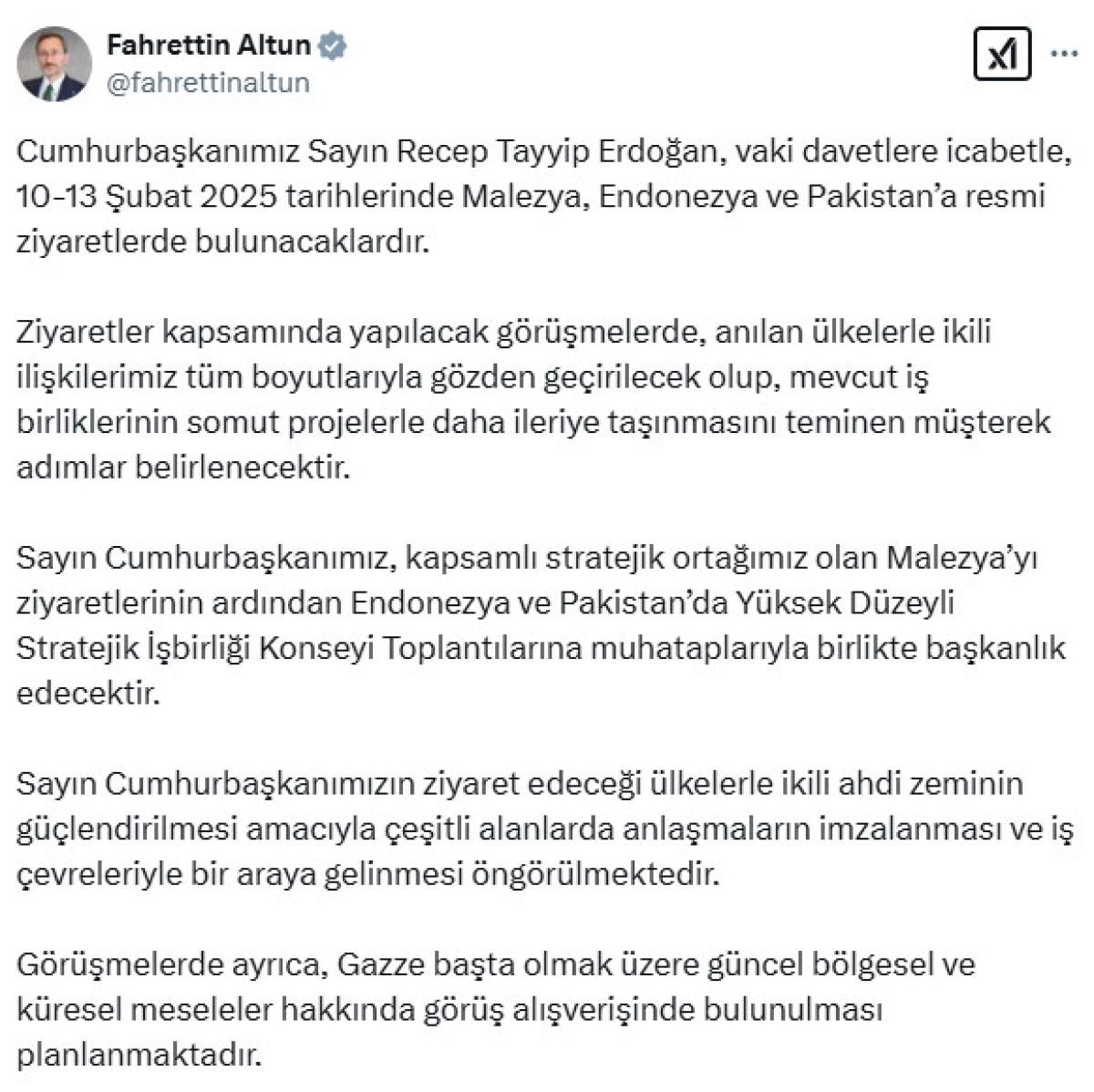 Erdoğan, 10-13 Şubat 2025 tarihlerinde Malezya, Endonezya ve Pakistan’a gidecek..
