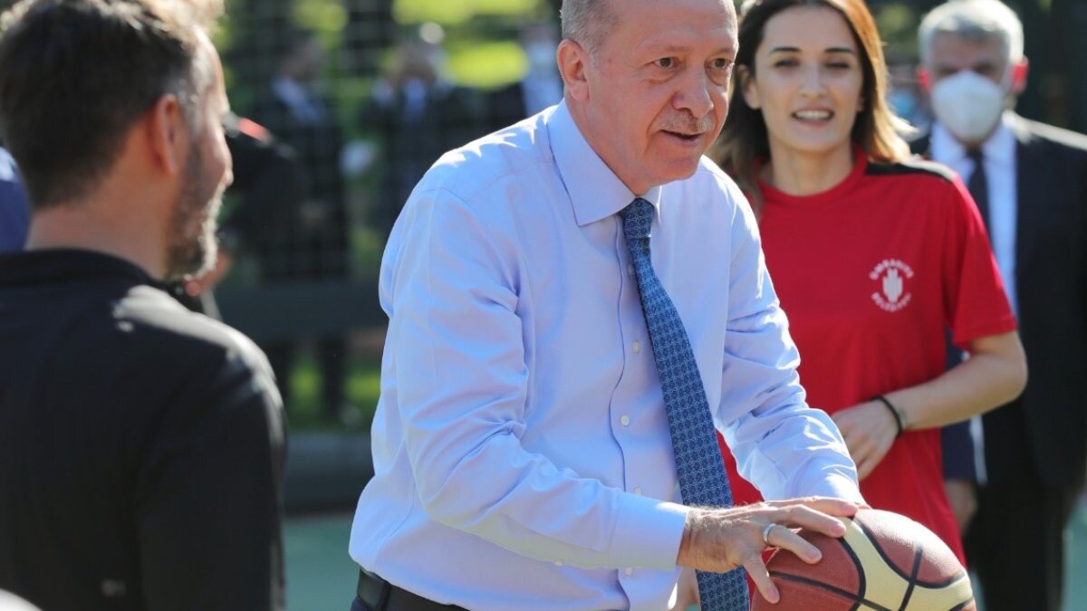 Basketbol sahasındaki gençlerin davetini kırmayan Cumhurbaşkanı Erdoğan, Cumhurbaşkanı Sözcüsü İbrahim Kalın'la birlikte ekibe katıldı.