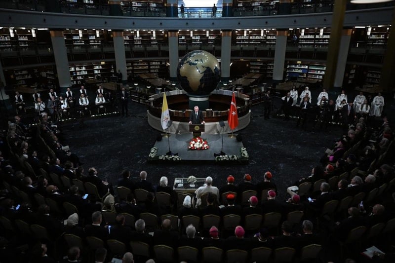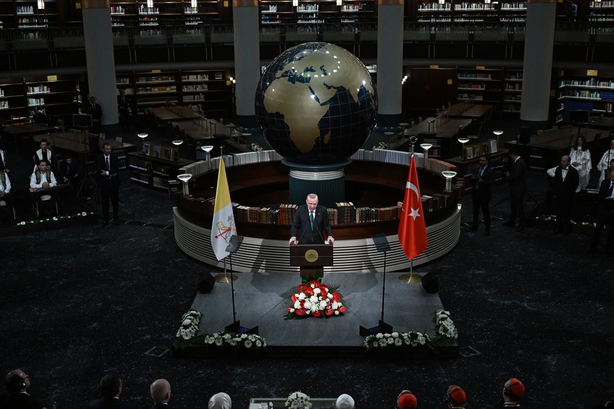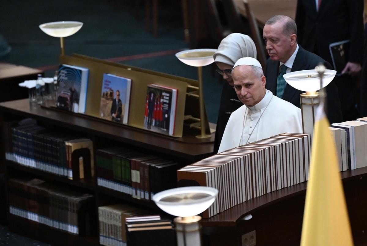 Beştepe'de bulunan Millet Kütüphanesi'nde, Papa 14'üncü Leo ile baş başa bir görüşme gerçekleştiren Cumhurbaşkanı Erdoğan, ortak basın toplantısı düzenledi.