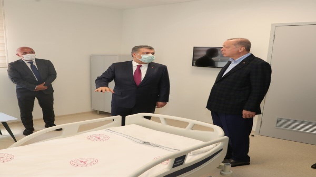 Sancaktepe'ye gelen Cumhurbaşkanı Erdoğan, odaları gezerken, Sağlık Bakanı Fahrettin Koca tarafından bilgilendirildi.
