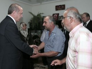 Erdoğan, başsağlığı dileklerinin ardından evden ayrılırken, "Şehitler ölmez, vatan bölünmez" sloganı atan ve tekbir getiren vatandaşları da selamladı.