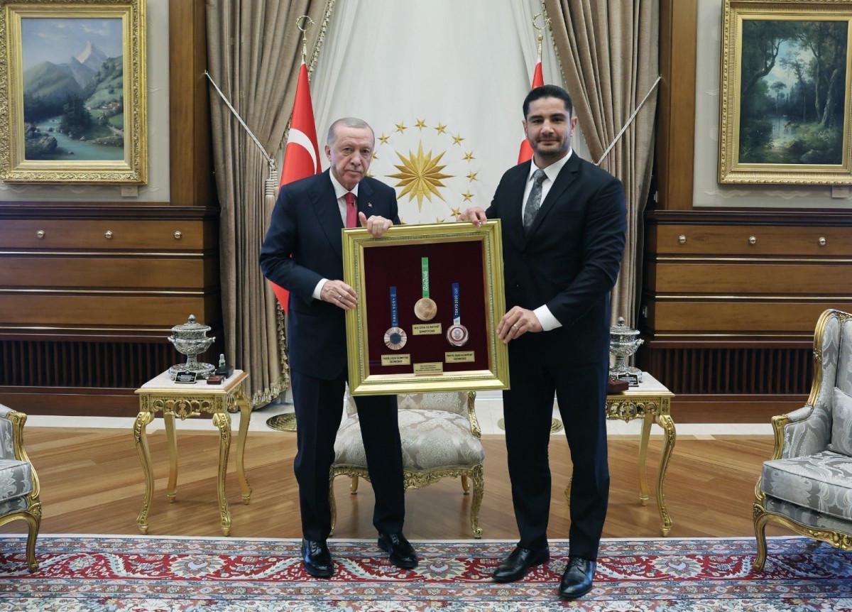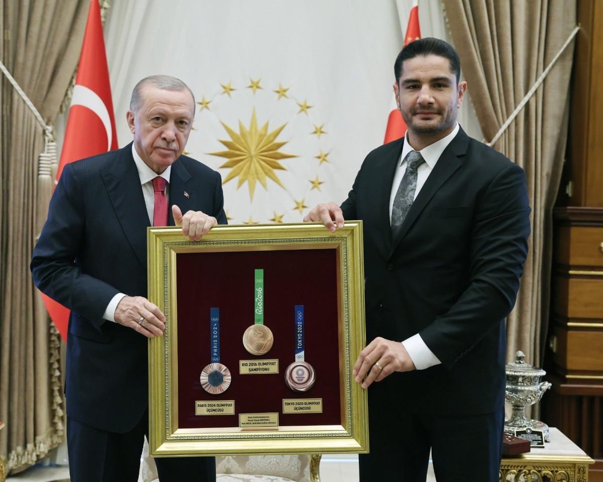Cumhurbaşkanlığı Külliyesi’nde gerçekleşen kabulde milli güreşçi, 2016 Rio Olimpiyatları’nda elde ettiği altın madalyası ile Tokyo 2020 Olimpiyatları ve Paris 2024 Olimpiyatları’ndaki bronz madalyaların yer aldığı tabloyu Cumhurbaşkanı Erdoğan’a hediye etti.