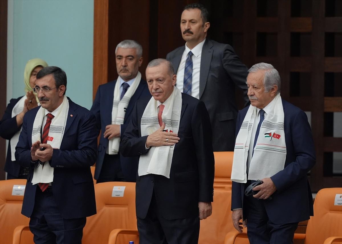 Tören mangasını selamlayan Erdoğan, Meclis'e girişinde Filistin Devlet Başkanı Mahmud Abbas ile bir süre sohbet etti.
