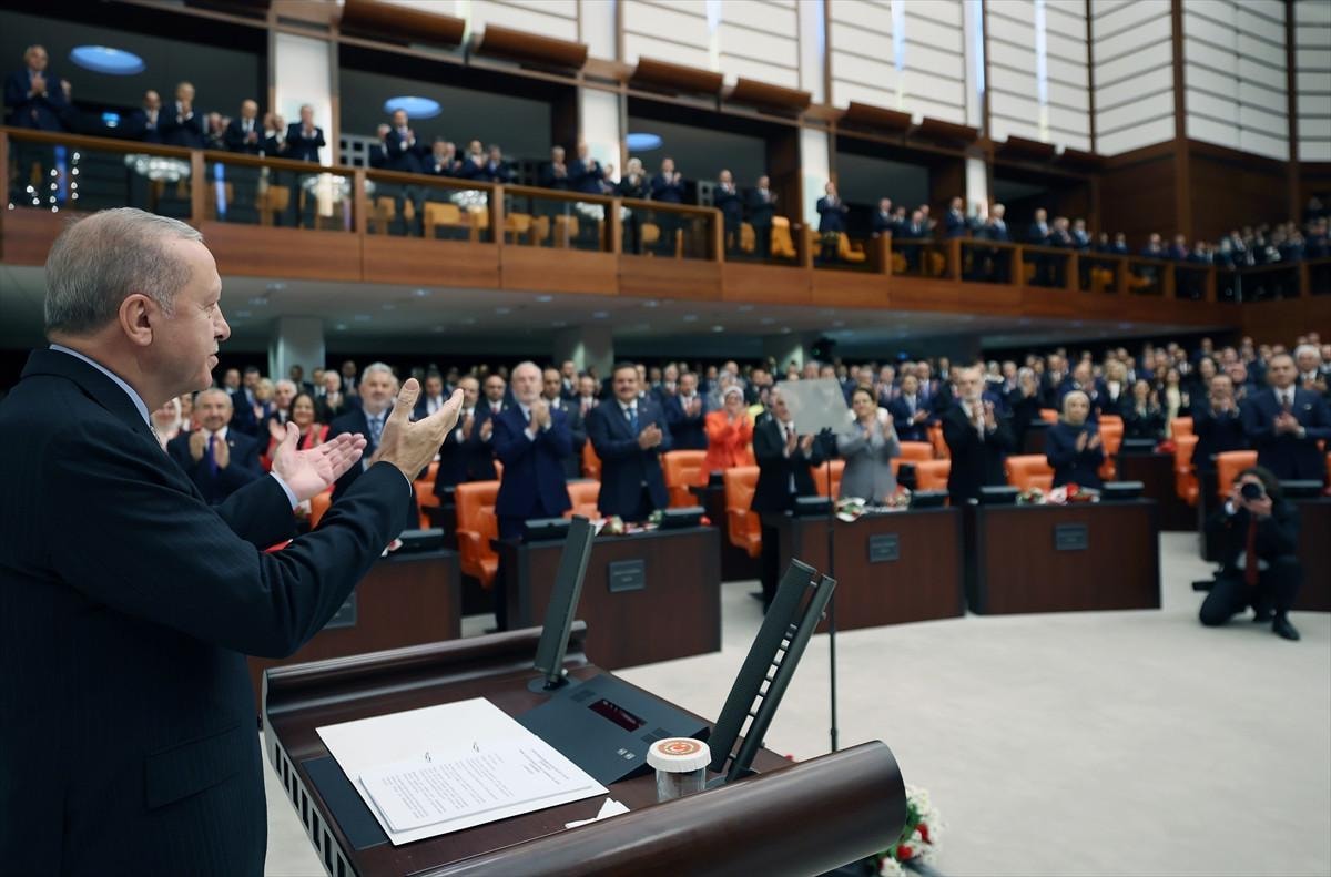 Meclis'te bulunan milletvekillerini selamlayan Erdoğan, dakikalarca alkışlandı.