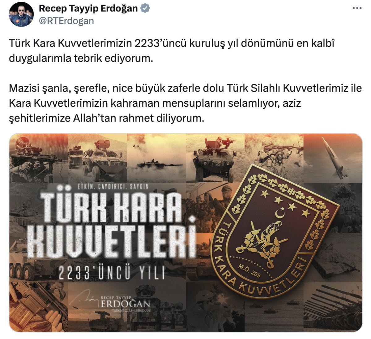 Cumhurbaşkanı Recep Tayyip Erdoğan, sosyal medya hesabından Türk Kara Kuvvetleri'nin 2 bin 233'üncü kuruluş yıl dönümü tebrik etti.