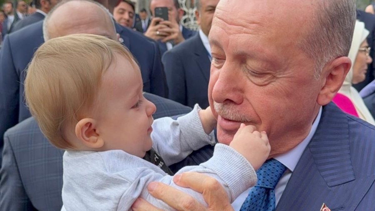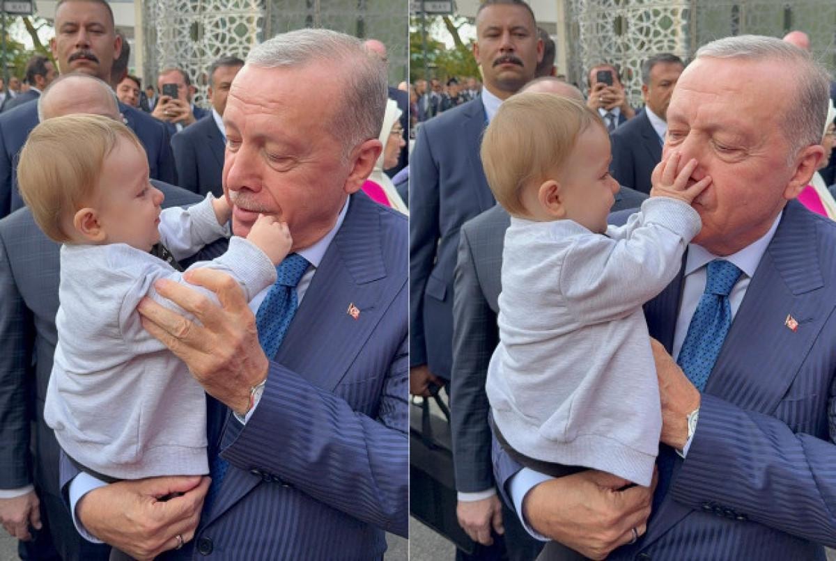 - Erdoğan, Almanya'dan gelen bir çiftin çocuğunu kucağına alarak sevgi dolu anlar yaşadı.