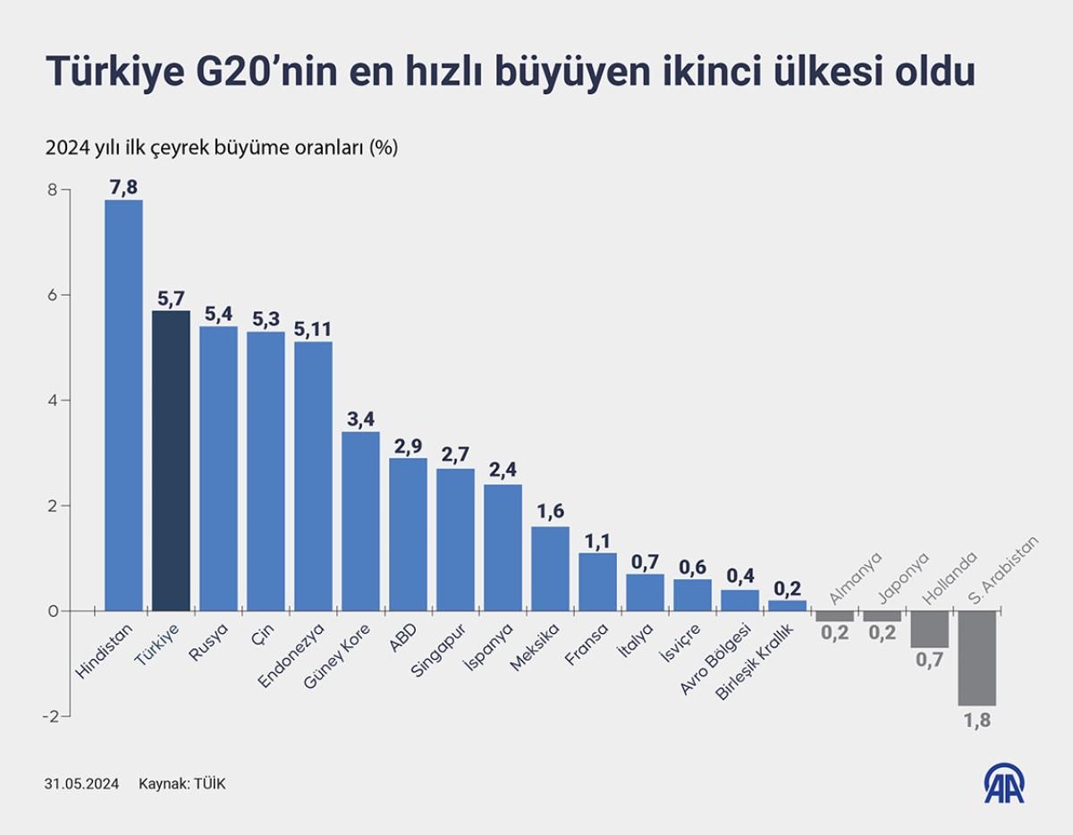 G20'de ise en hızlı büyüyen ülke yüzde 7,8 ile Hindistan oldu. Bu ülkeyi yüzde 5,7 ile Türkiye izlerken, yüzde 5,4 ile Rusya üçüncü, yüzde 5,3 ile Çin dördüncü ve yüzde 5,11 ile Endonezya beşinci sırada yer aldı.
