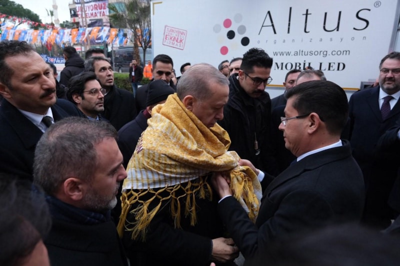 Belediye Meydanı’ndan toplanan coşkulu kalabalığa hitap eden Cumhurbaşkanı Erdoğan, konuşmasının ardından kendisini görünce gözyaşlarını tutamayan Pınar Ersoy’a üzerine taktığı poşuyu hediye etti.
