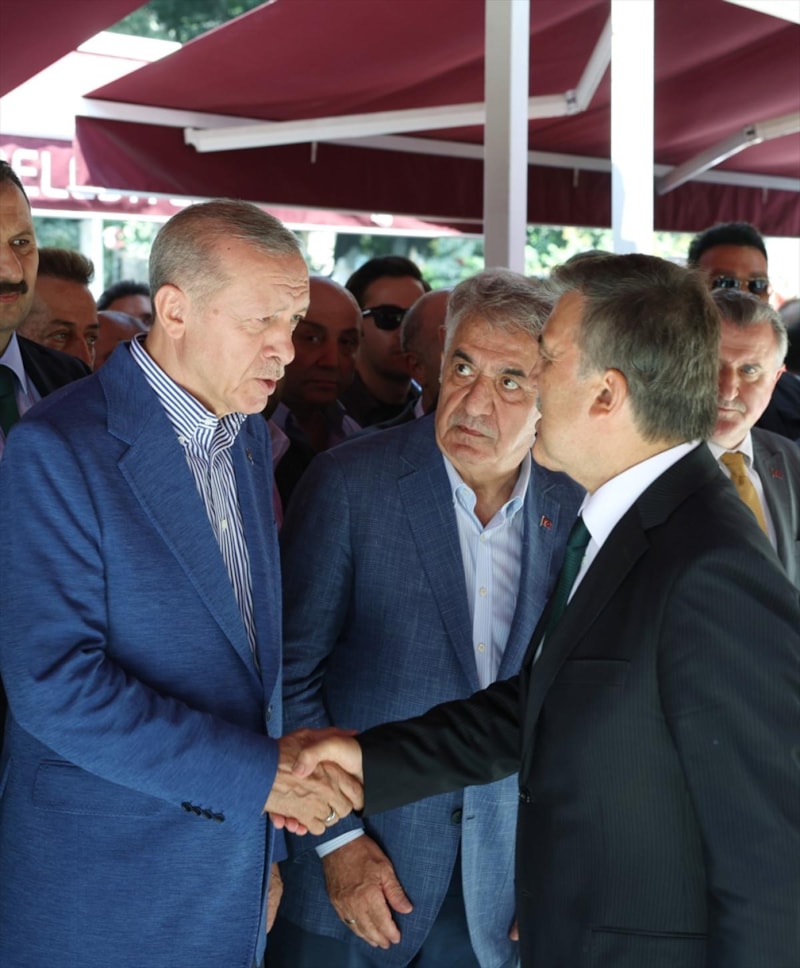 Cenazeye katılan Abdullah Gül, önce Cumhurbaşkanı Erdoğan ile tokalaştı.