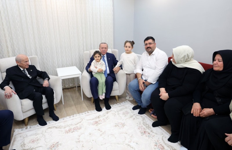 Cumhurbaşkanı Recep Tayyip Erdoğan ve MHP Genel Başkanı Devlet Bahçeli, Hatay’da depremzede Karakuş ailesini yeni evlerinde ziyaret etti.