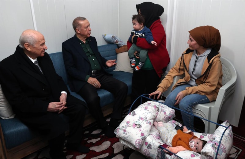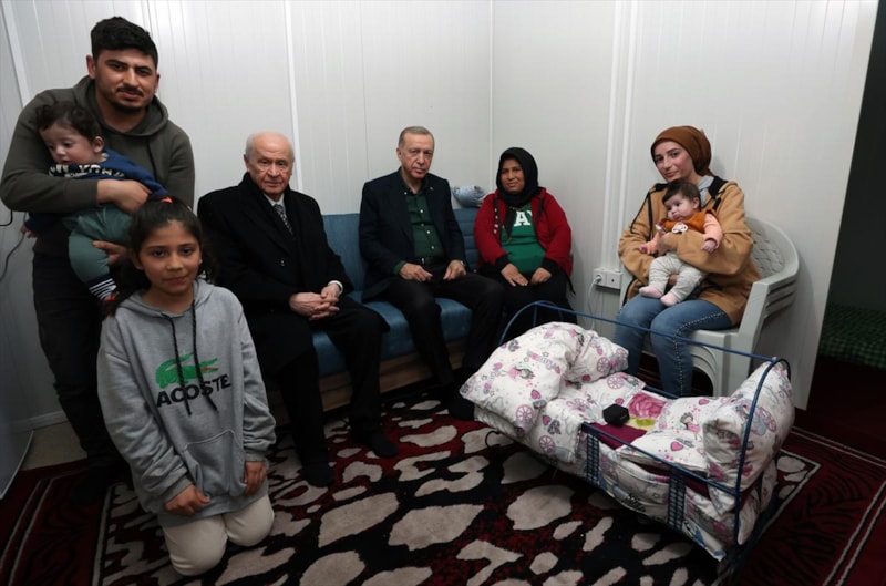 İki lider, kentte iyileştirme çalışmalarını inledikten sonra konteynerları gezdi. Burada depremzedelerle bir araya gelen Cumhurbaşkanı Erdoğan ve Devlet Bahçeli, vatandaşlarla sohbet ederek sorunlarını dinledi.