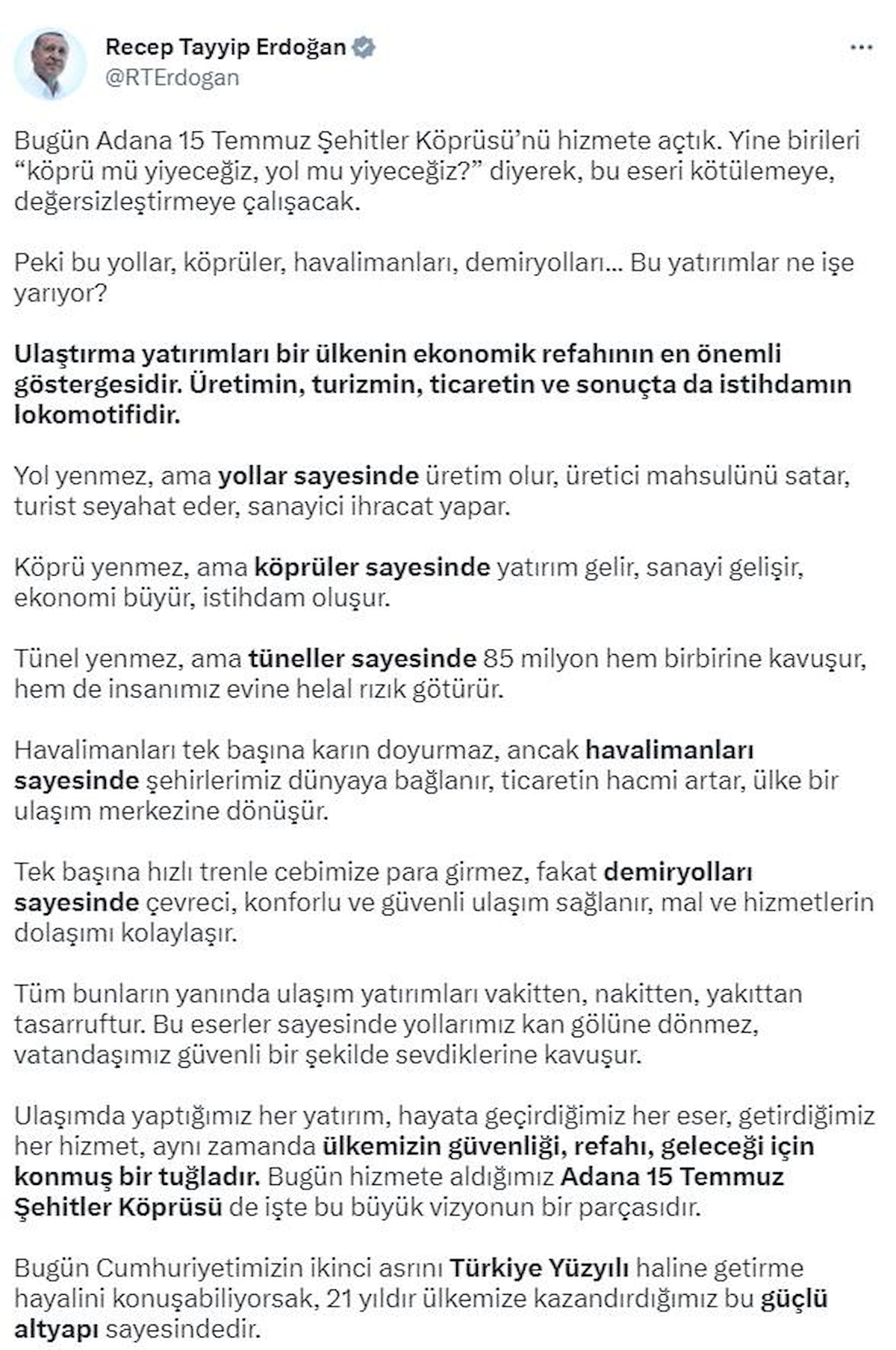 Bu eserler sayesinde yollarımız kan gölüne dönmez, vatandaşımız güvenli bir şekilde sevdiklerine kavuşur. Ulaşımda yaptığımız her yatırım, hayata geçirdiğimiz her eser, getirdiğimiz her hizmet, aynı zamanda ülkemizin güvenliği, refahı, geleceği için konmuş bir tuğladır. Bugün hizmete aldığımız Adana 15 Temmuz Şehitler Köprüsü de işte bu büyük vizyonun bir parçasıdır. Bugün Cumhuriyetimizin ikinci asrını Türkiye Yüzyılı haline getirme hayalini konuşabiliyorsak, 21 yıldır ülkemize kazandırdığımız bu güçlü altyapı sayesindedir.