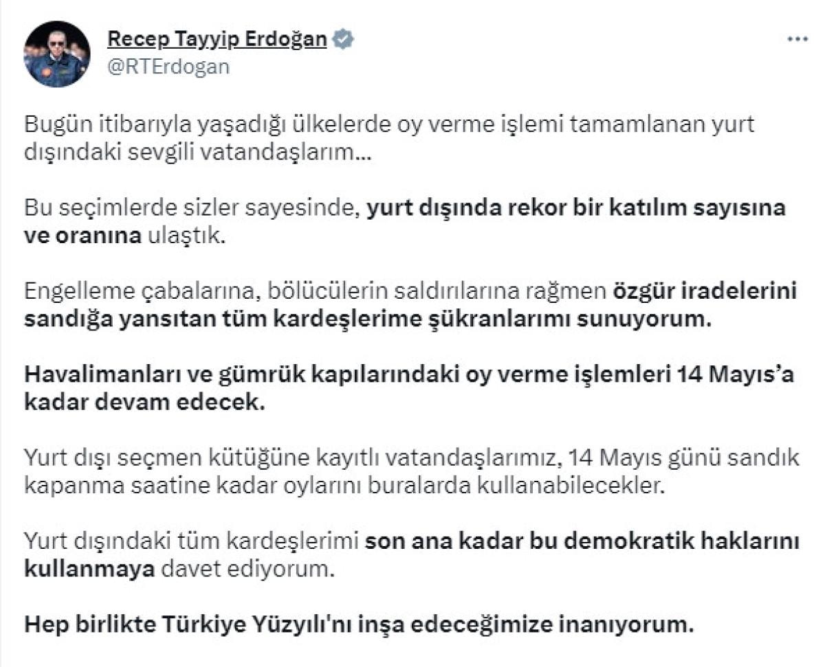 Cumhurbaşkanı Recep Tayyip Erdoğan da, sosyal medya hesabından yaptığı paylaşımla yurt dışında oy kullanan vatandaşlara seslendi.