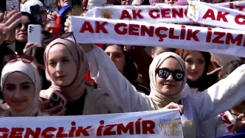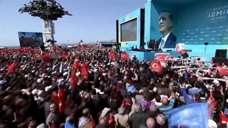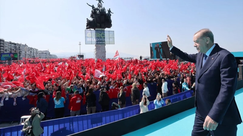 Partisinin mitingine katılmak üzere İzmir'e gelen Cumhurbaşkanı Recep Tayyip Erdoğan, tören alanında coşkulu bir kalabalık tarafından karşılandı. Cumhurbaşkanı Erdoğan, İzmir mitingine 100 bin kişinin katıldığını açıkladı.