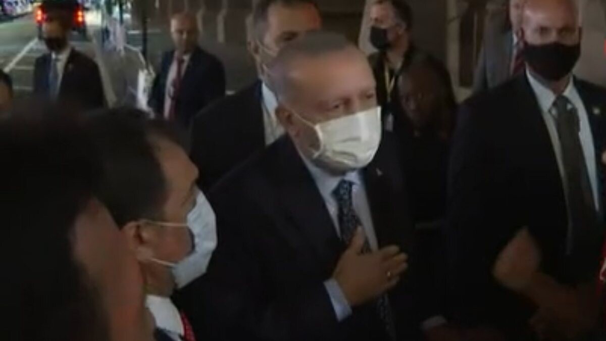 Erdoğan, konakladığı otele geldiği sırada Türk vatandaşları tarafından coşkuyla karşılandı.