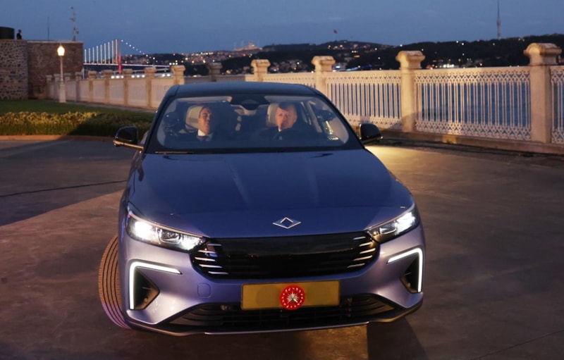 Cumhurbaşkanı Erdoğan, Dolmabahçe'deki Çalışma Ofisi'ne getirilerek Cumhurbaşkanlığı forsu takılan mavi renkli T10F ile kısa bir test sürüşü yaptı.