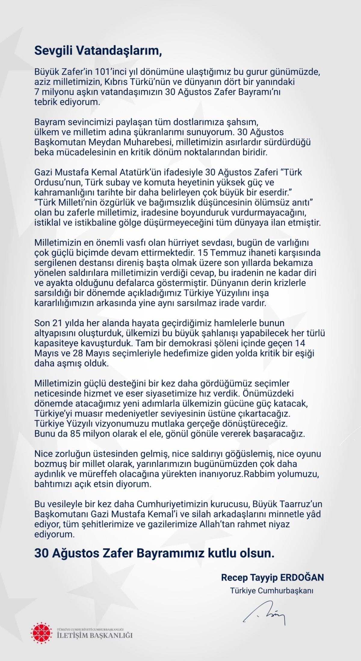 Cumhurbaşkanı Recep Tayyip Erdoğan da 30 Ağustos Zafer Bayramı'nın yıl dönümünde bir mesaj yayınladı.