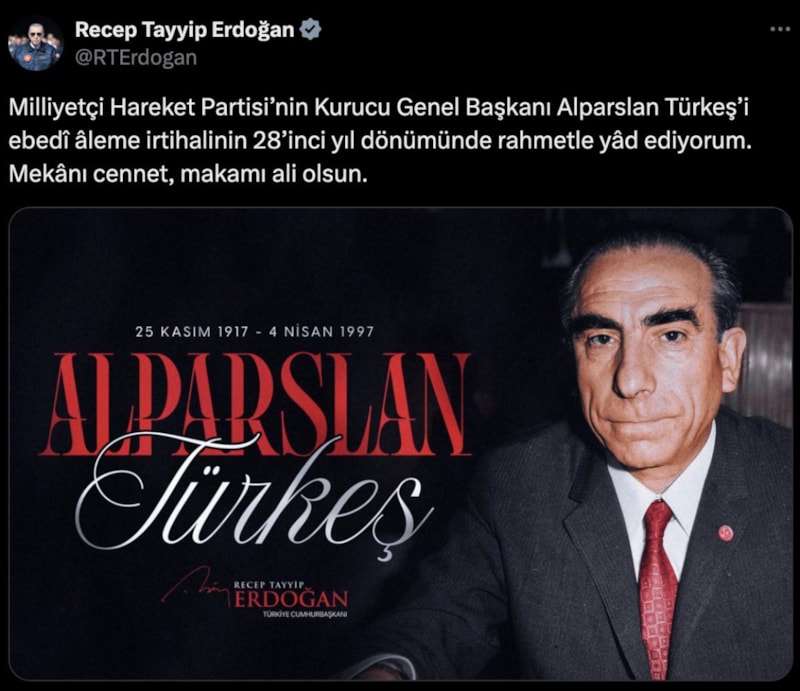 Alparslan Türkeş'i vefatının yıl dönümünde anan isimlerden biri de Cumhurbaşkanı Recep Tayyip Erdoğan oldu.
