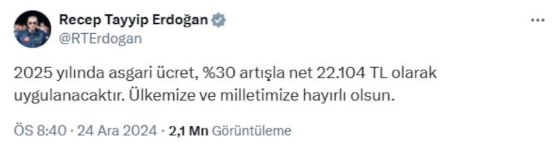 2025 yılı için asgari ücret 22 bin 104 lira oldu. Cumhurbaşkanı Recep Tayyip Erdoğan, "Ülkemize ve milletimize hayırlı olsun" mesajını paylaştı.