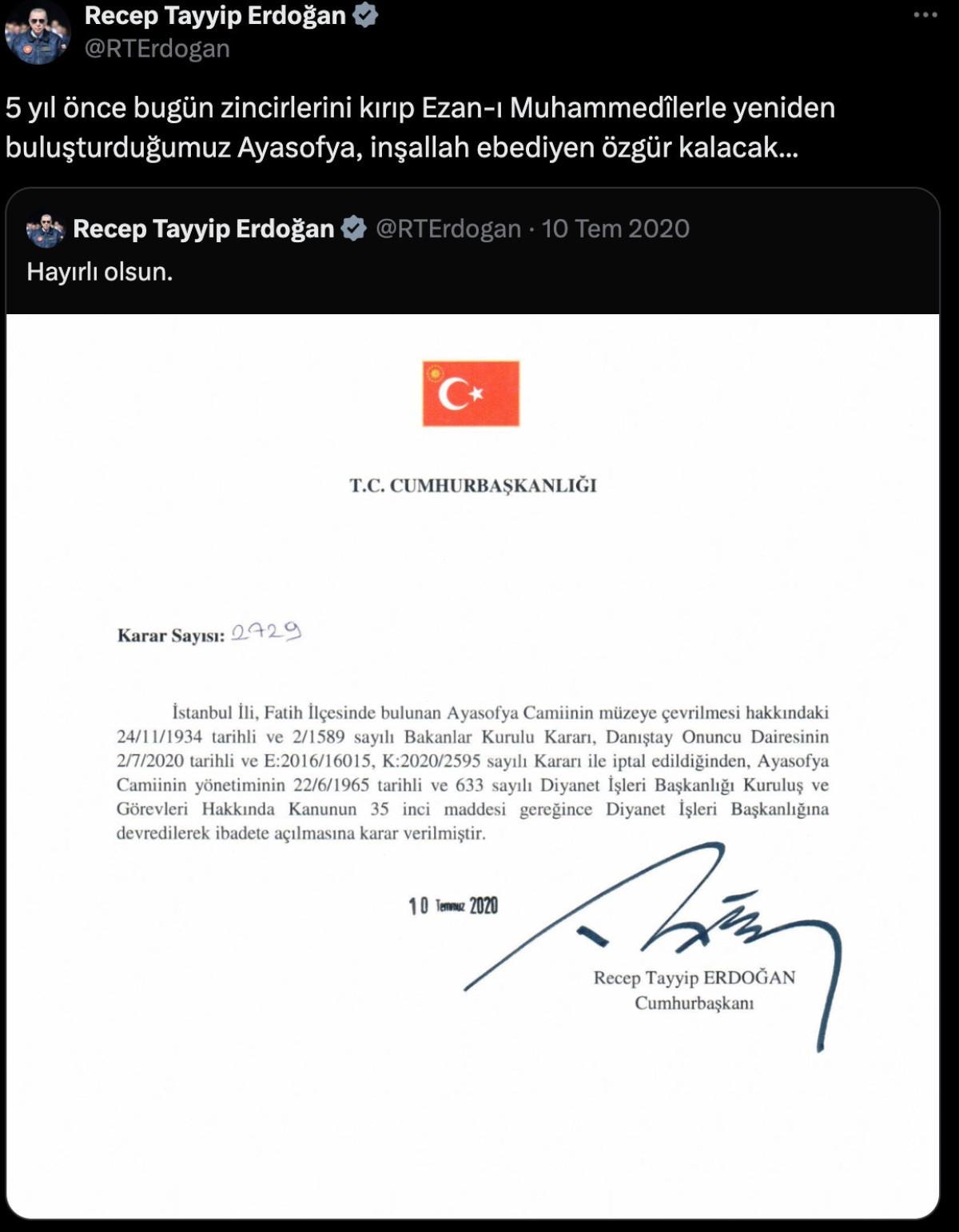 Cumhurbaşkanı Recep Tayyip Erdoğan, 10 Temmuz 2020 tarihinde attığı, Ayasofya'nın yeniden ibadete açılmasına yönelik kararnameye ilişkin paylaşımını alıntılayarak, şu ifadelere yer verdi: