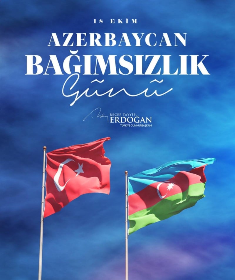 Dünyada eşi benzeri olmayan bir kardeşliğe sahip olduğumuz Can Azerbaycan'ın bağımsızlık yıl dönümünü en kalbî duygularımla tebrik ediyorum. Cumhurbaşkanı İlham Aliyev gardaşıma ve tüm Azerbaycan halkına bu gurur günü vesilesiyle Türkiye'nin selamını iletiyorum.