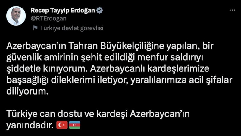 "Azerbaycan’ın Tahran Büyükelçiliğine yapılan, bir güvenlik amirinin şehit edildiği menfur saldırıyı şiddetle kınıyorum. Azerbaycanlı kardeşlerimize başsağlığı dileklerimi iletiyor, yaralılarımıza acil şifalar diliyorum.